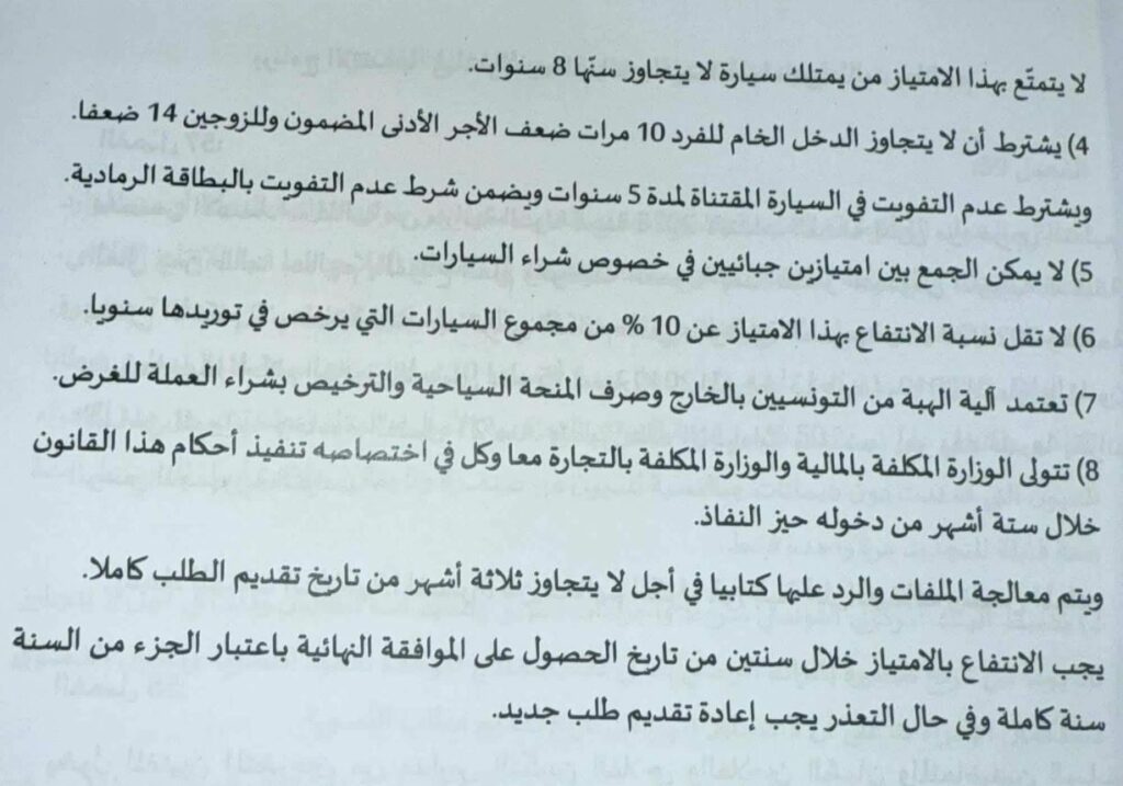 ويُشترط أيضًا أن لا ينتفع بهذا القانون كلّ من يمتلك سيارة عمرها أقل من 8 سنوات، إضافة إلى تحديد سقف الدخل بـ 10 مرات الأجر الأدنى المضمون للفرد و14 مرة للزوجين.