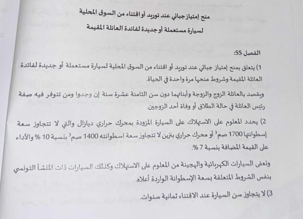 وينصّ الفصل 55 في صيغته المُعتمدة على تمكين كلّ عائلة من توريد سيارة واحدة معفاة من المعاليم الديوانية، على أن لا يتجاوز عمرها 8 سنوات، مع منع الجمع بينها وبين السيارة الشعبية.